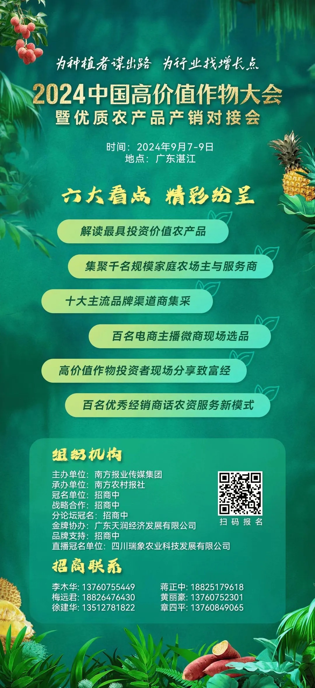 9月7-9日,由南方报业传媒集团主办、南方农村报社承办的2024中国高价值作物大会暨优质农产品产销对接会将在广东湛江召开。为树立行业标杆,挖掘一批在科研、生产、流通、销售产业链各环节的高价值作物产业带头人,南方农村报启动百名高价值作物产业带头人评选活动,即日起面向全国广泛征集,并在2024中国高价值作物大会上发布百名榜单。