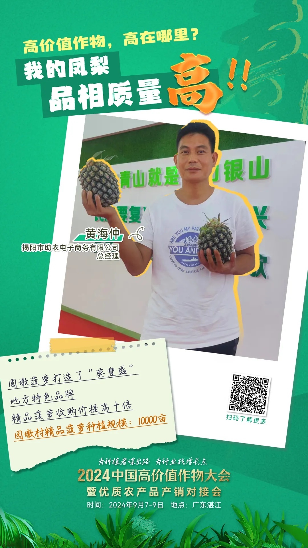 “我的凤梨品相质量高!”黄海仲所在的揭阳市助农电子商务有限公司打造了“葵豐盛”地方特色品牌,种植面积达1万亩,该精品菠萝收购价提高了10倍。